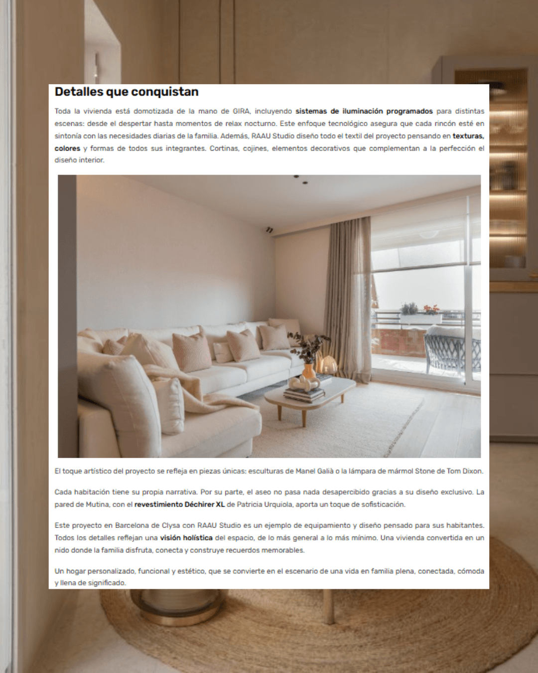 Desarrollado junto a RAAU Studio, el proyecto pone el foco en la personalización, la selección de materiales y el diseño de mobiliario a medida. La cocina Santos, equipada con soluciones de altas prestaciones y domótica de GIRA, se convierte en el corazón del hogar dentro de una propuesta que integra funcionalidad, tecnología y coherencia estética en cada detalle.