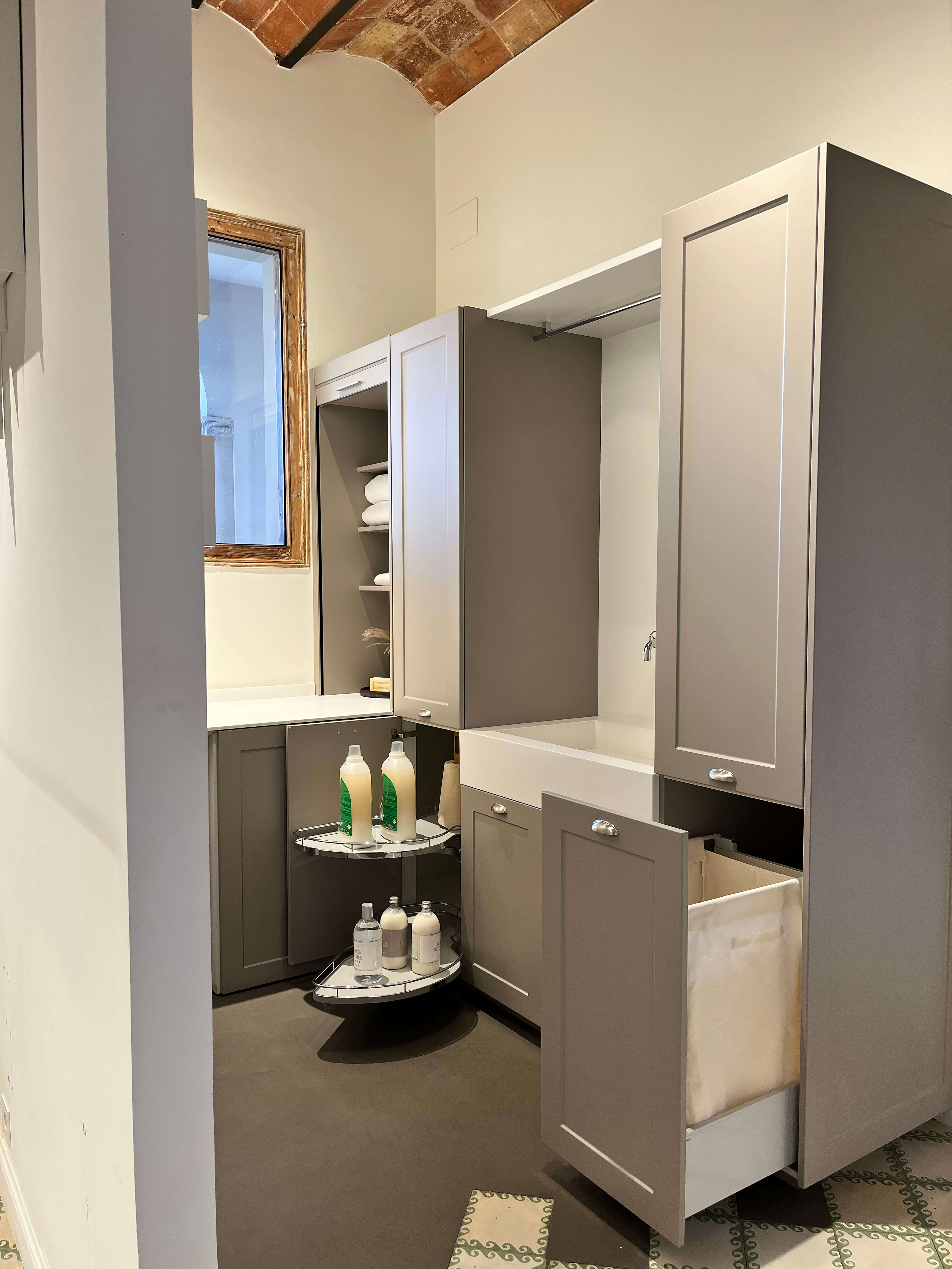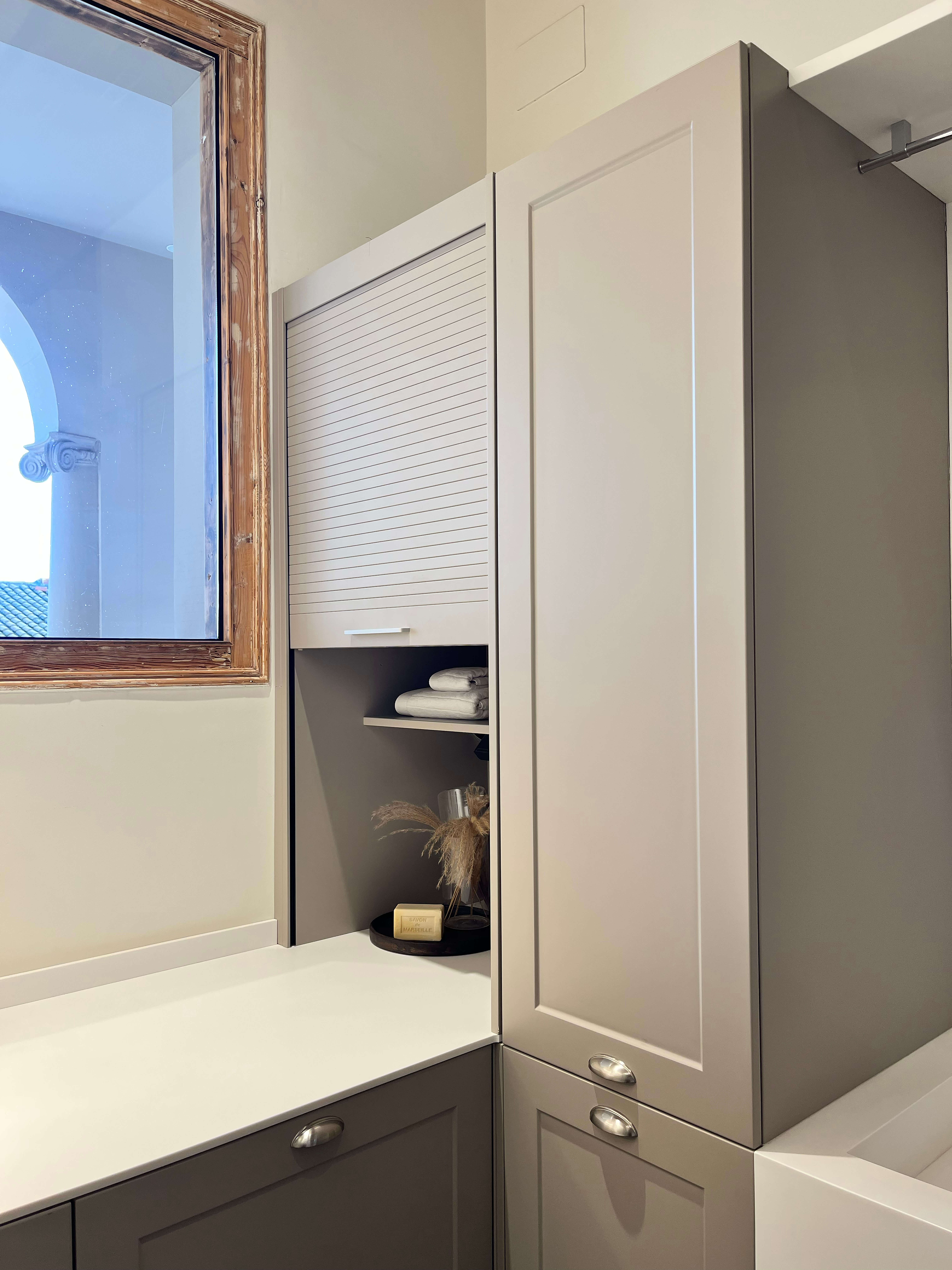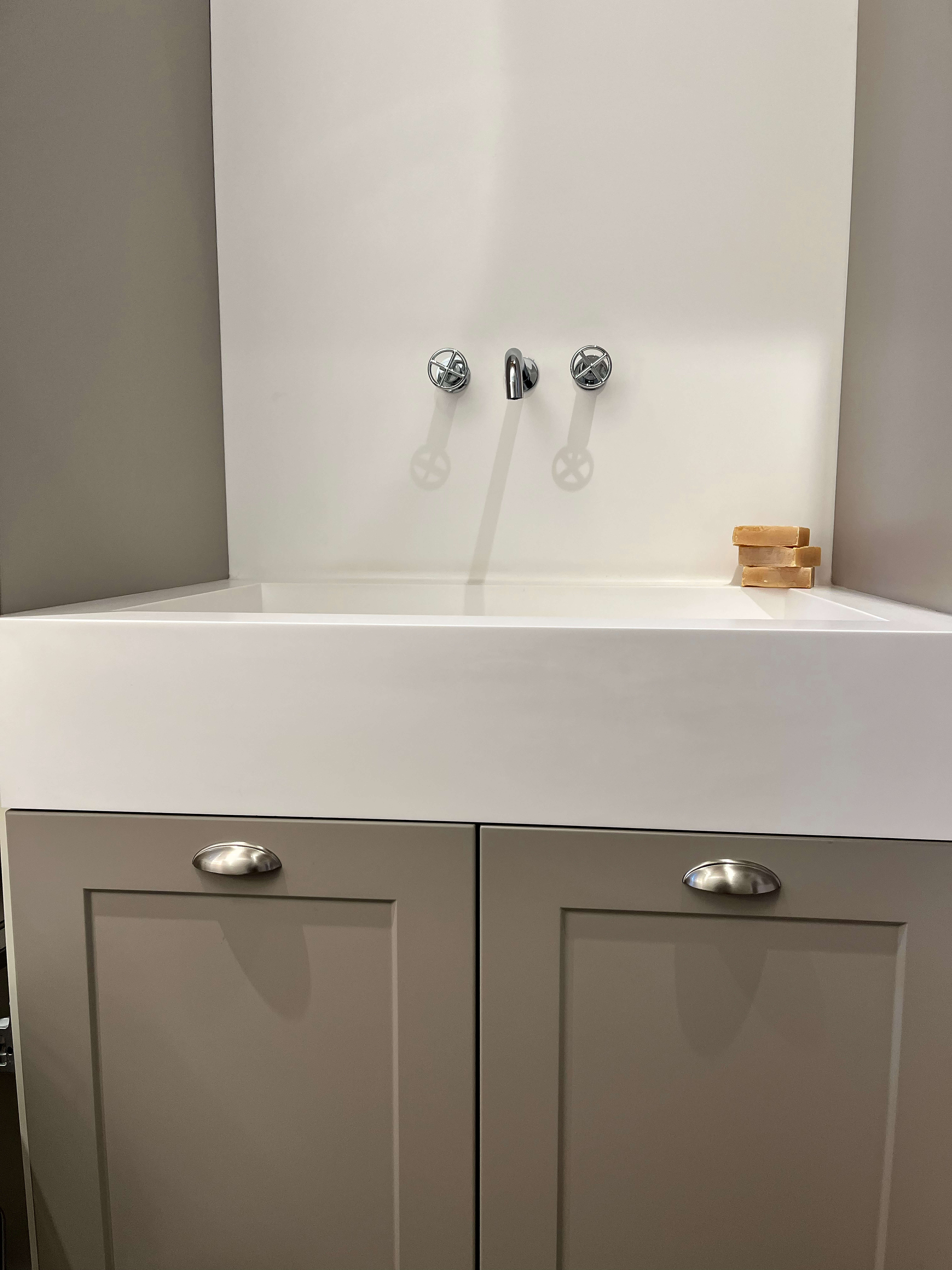 Lacado seda mate gris arena y encimera solid surface blanco